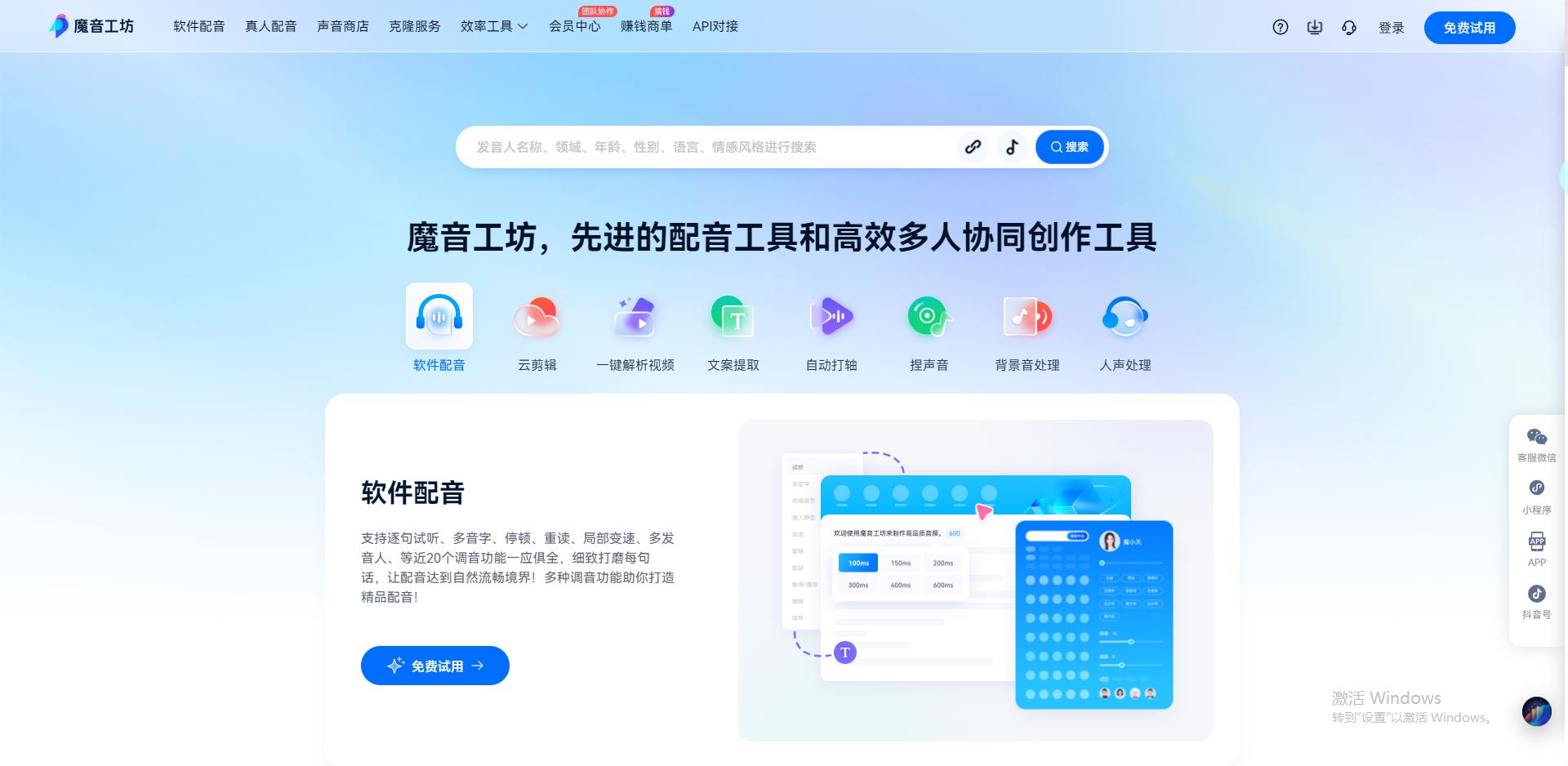 魔音工坊,先进的配音工具和高效多人协同创作工具。除了配音工具之外,还有以下功能:软件配音、云剪辑、一键解析视频、文案提取、自动打轴、捏声音、背景音处理、人声处理