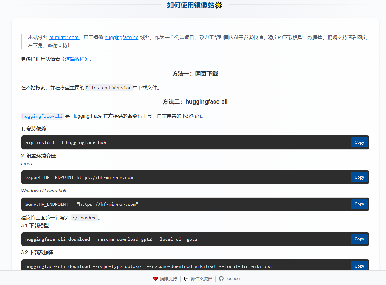 域名 hf-mirror.com,用于镜像 huggingface.co 域名。作为一个公益项目,致力于帮助国内AI开发者快速、稳定的下载模型、数据集。