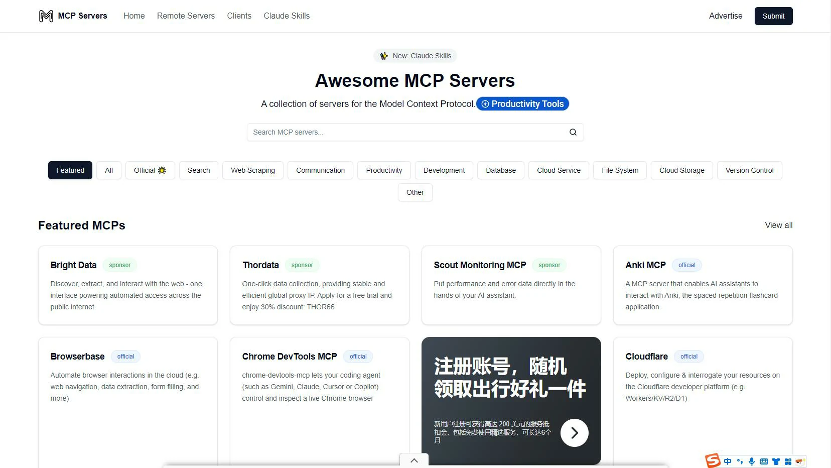 MCP Servers 是一个收集模型上下文协议 (Model Context Protocol) 服务器的平台,在这里您可以找到各种类型的MCP服务器,方便开发者和用户使用。