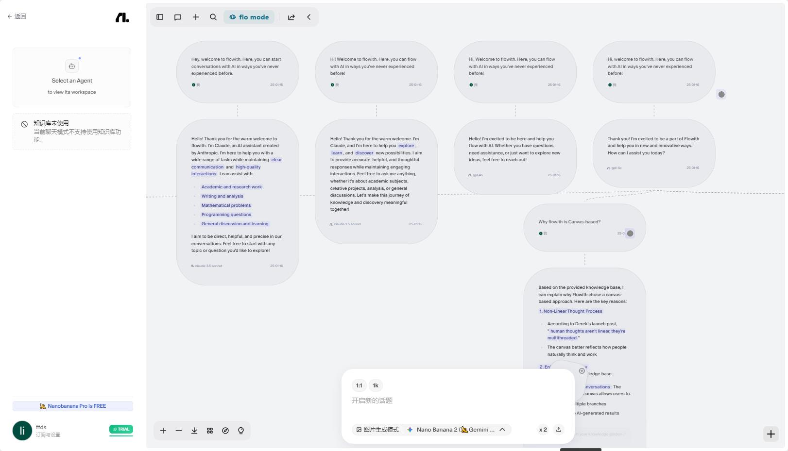 - Flo mode(节点视图):支持插入节点、居中视图、删除节点。生成的每一次对话、图片或视频都会以“卡片节点”的形式呈现,节点之间通过虚线连接,清晰展示内容的生成路径和逻辑关系。
